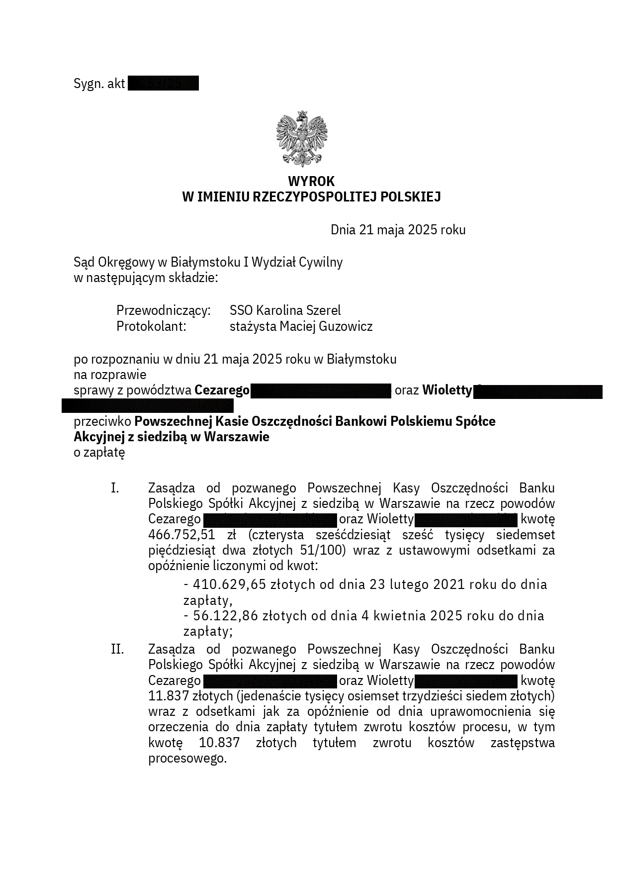 Sąd zasądził nie tylko nadpłacenie odsetek, ale również pełną rekompensatę za lata stresu finansowego. Bank musi pokryć wszystkie koszty procesu.